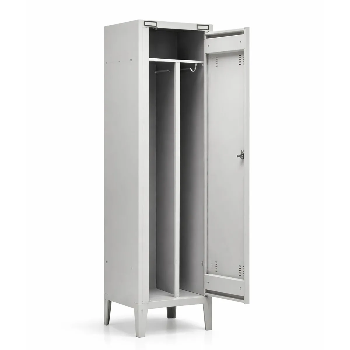Ogni vano interno è dotato di ripiano superiore in metallo, divisorio verticale e 4 ganci appendiabiti, una configurazione pensata per la separazione degli indumenti puliti da quelli utilizzati.