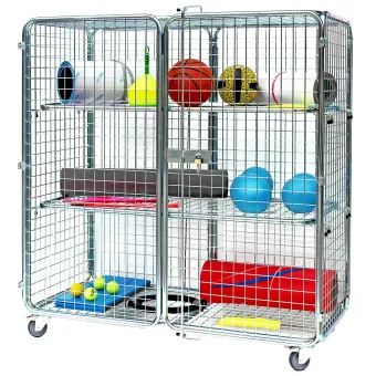 Contenitore per palloni e piccoli attrezzi con telaio in tubolare di acciaio zincato, pannelli in rete d'acciaio elettrosaldata con foro 6x6 cm, montato su 4 ruote gommate piroettanti di cui due dotate di freno.