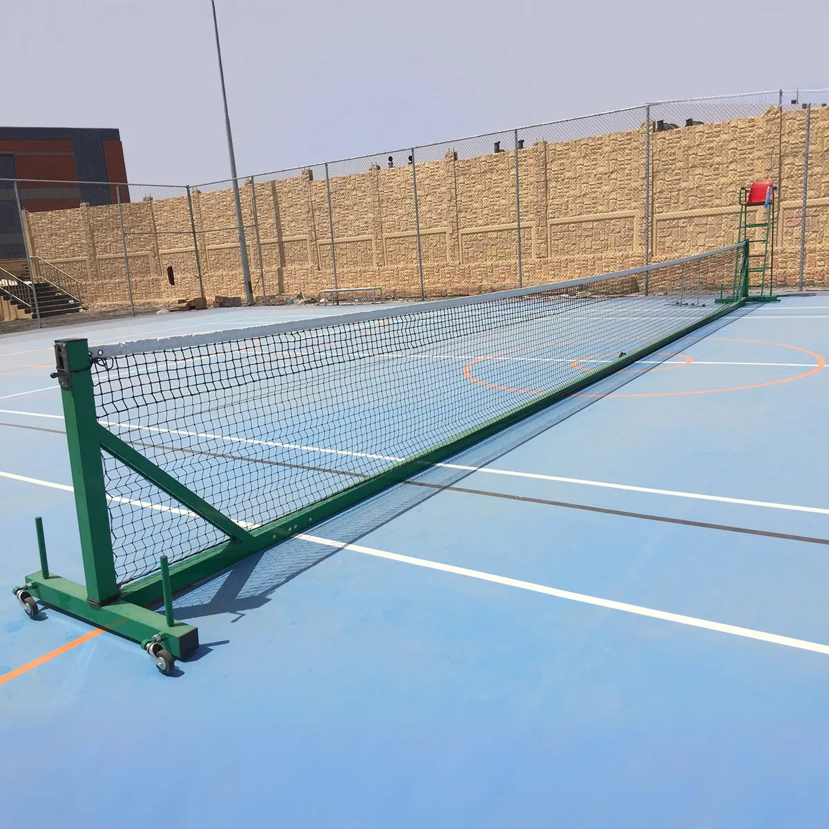 Impianto per campo da tennis con struttura in tubolare d’acciaio 80×80 mm, pali reggirete collegati da traversa superiore e sistema con ruote per movimentazione.