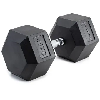 I manubri esagonali sono ben bilanciati e, rispetto ai manubri con teste tonde, non rotolano quando vengono appoggiati a terra. Il rivestimento in gomma delle teste evita qualsiasi danno alla pavimentazione in caso di caduta, fornisce una buona protezione all'utilizzatore ed elimina qualsiasi rumore in caso di impatto durante l'esercizio o quando viene riposto. La zigrinatura dell'impugnatura assicura una presa sicura in ogni condizione.
