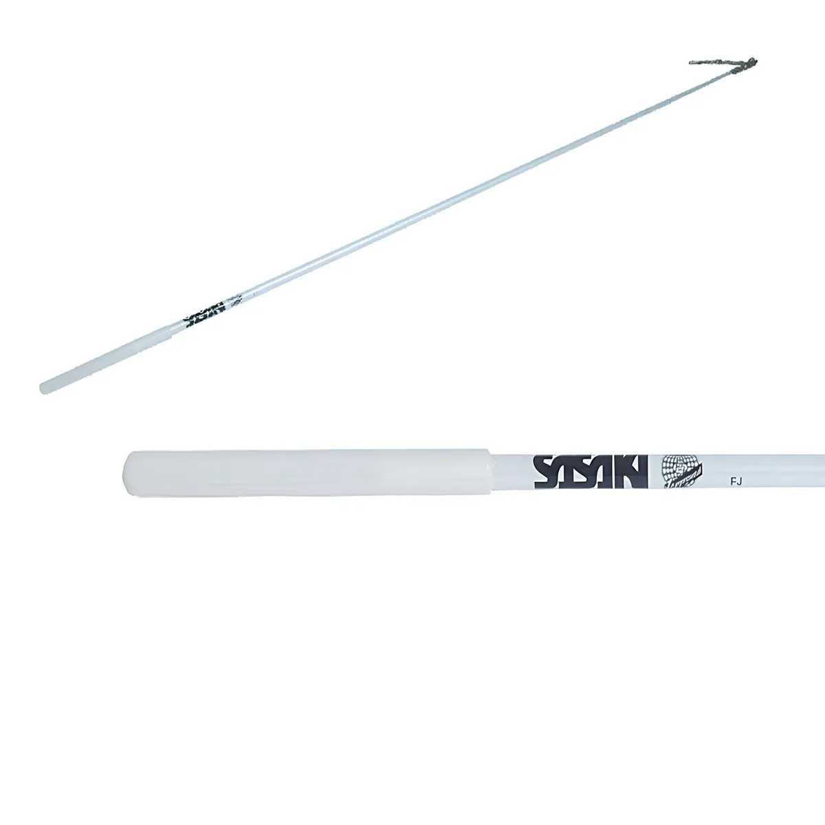 Bastoncino per nastro SASAKI in fibra di vetro, con impugnatura in gomma nera e snodo su terminale in metallo di tipo conico, colore bianco, omologato FIG e marchiato secondo le norme 2019 per le gare internazionali.