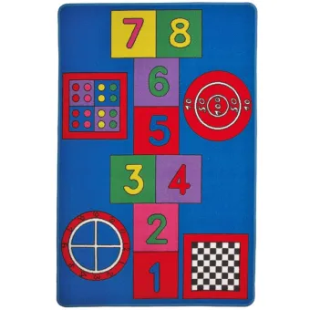 Sul tappeto sono disegnati una scacchiera, un orologio, un bersaglio e il gioco della campana che lo rendono un campo di gioco morbido, confortevole e molto divertente.
