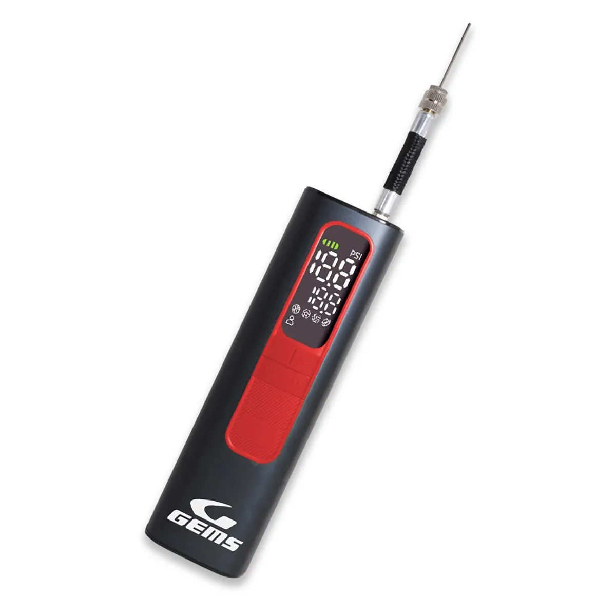 Pompa per palloni con display digitale e corpo in lega di alluminio, piccola e leggera, con batteria al litio 2600 mAh e ricarica DC 5V/2A. Pressione massima 18 PSI, rumorosità 50 dB e utilizzo possibile tra -20 e 55°C.