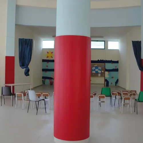 Protezione antitrauma sp. 22 mm realizzata su misura per pali e colonne tonde, adatta a palestre, scuole e asili. Il prodotto è realizzato in espanso reticolato rivestito con PVC antigraffio e lavabile ed è certificato ignifugo Classe 1.