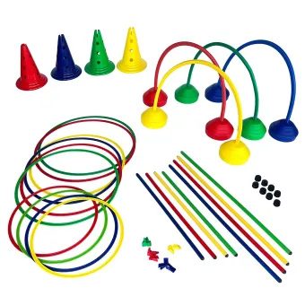 Gli archi, inseriti nelle apposite basi zavorrabili, posti in successione creano un tunnel colorato. Le aste ginniche fabbricate in materiale antiurto e antinfortunistico, con alle estremità tappi arrotondati antigraffio, se inserite nelle basi zavorrabili, nei coni o se congiunte tra di loro tramite clip, creano un ostacolo. I coni, con fori e incavi, permettono l'inserimento di aste e cerchi piatti. Questi ultimi, realizzati appositamente in nylon, sono molto resistenti e flessibili.